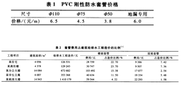 建筑施工給排水工程施工說明規定:管道穿越樓面、屋面、水箱,需預埋剛性防水套管。工程實踐表明,防水套管在一定程度上能夠解決衛生間樓板的滲水問題。而剛性防水套管可以解決滲漏問題,但是費用也不低,PVC剛性防水套管價格見表1,防水套管費用占建筑給排水工程造價的比例見表2。
